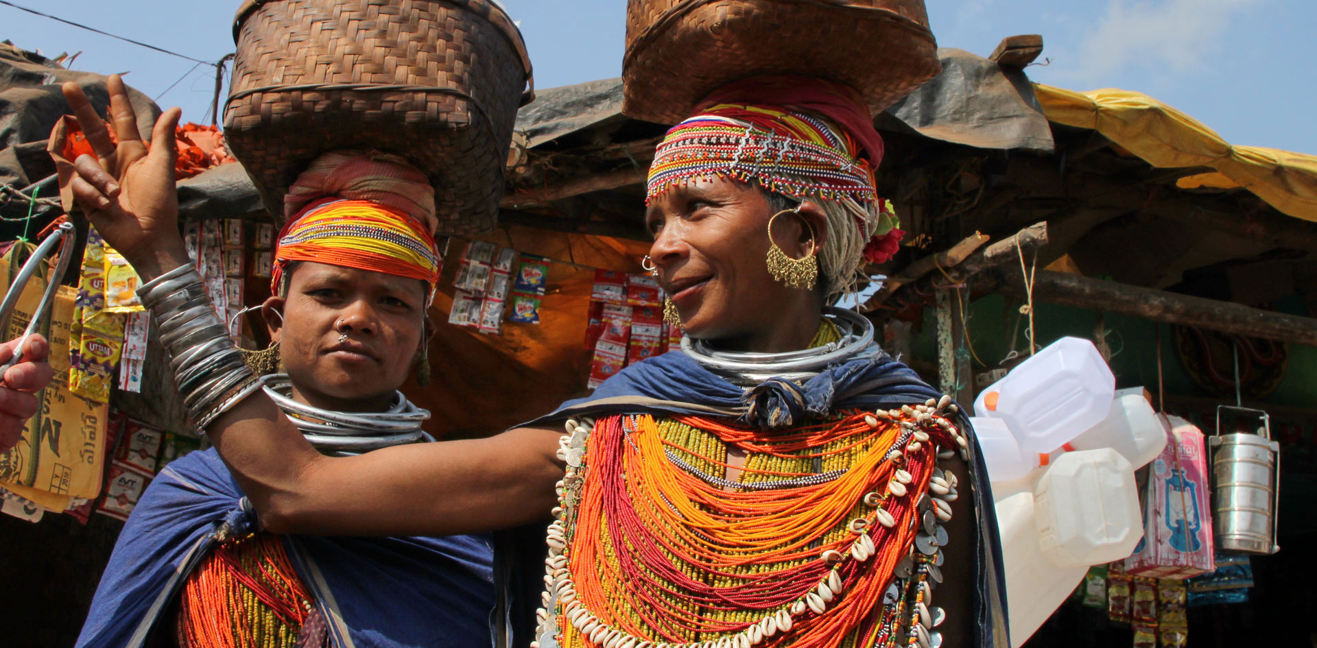 Wir fahren ca. 70 km zum Onukudelli Markt. Jeden Donnerstag findet hier ein Wochenmarkt statt, wo wir die Mitglieder des Bonda und Gadaba Stammes treffen werden. Die Bonda wohnen in den Bergen, bauen Reis an und leben von der Viehhaltung. Die Frauen sind reich mit langen Perlenketten sowie dicken Halsringen aus Silber und Messing, geschmückt. Kahl rasiert, tragen sie außer einem Lendentuch keine Kleider. Am Morgen tragen sie gegen die Kälte noch ein Schultertuch.