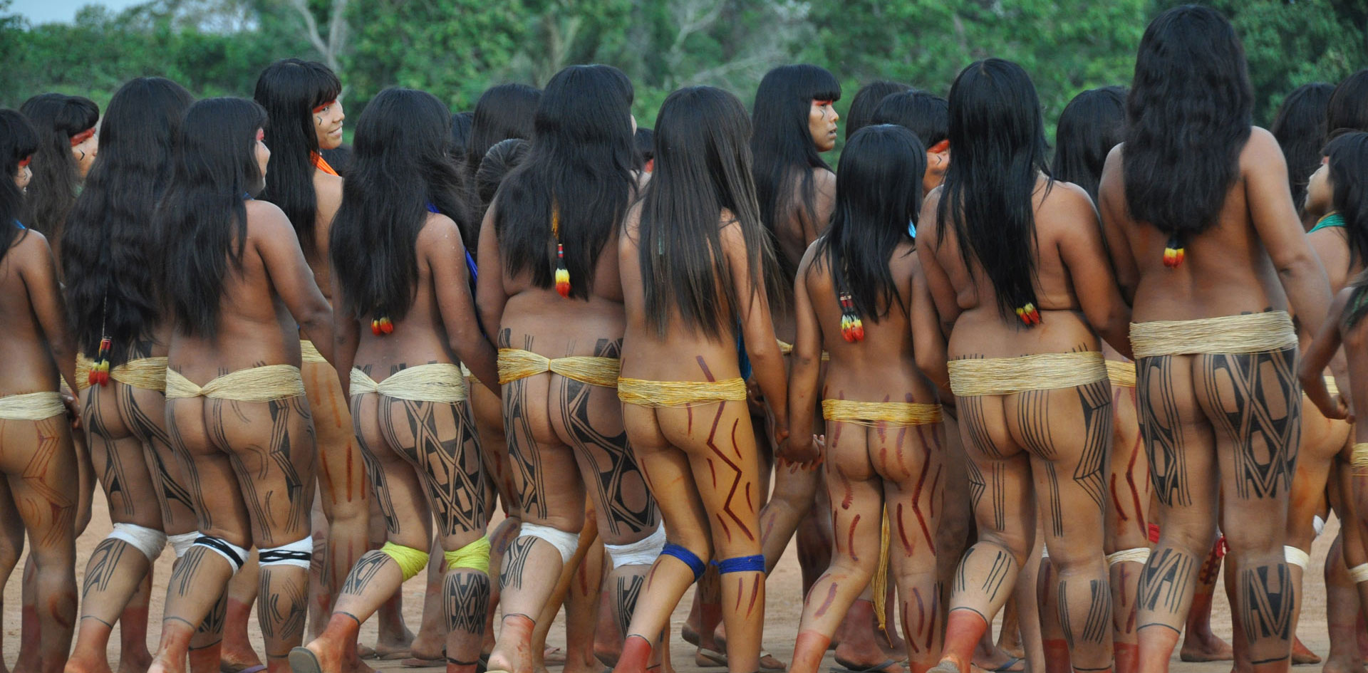 Die Indianer, vom Xingu (Bundesstaat Mato Grosso) feiern das Fest der Pequi-Palmfrucht mit viel Tanz und Gesang. Die Frucht, die wild wächst und viele Vitamine, Proteine und Mikronährstoffe enthält, ist eine wertvolle Bereicherung des Speiseplans der Xingu. Mit ihrem Fruchtfleisch wissen die Frauen verschiedene Gerichte zu bereiten wie zum Bespiel die Piqui-Suppe, welches alle Xingu Indianer verehren. Das Öl der Pequi-Frucht wird aus dem Fleisch und den Kernen gepresst – es ist reich an Betacarotin. Mit ihm pflegen die Frauen ihre Haare und schützen auch die Haut gegen die intensive Sonnenbestrahlung. Frauen und Kinder ernten die Piqui Früchte von den Pflanzungen und laufen bepackt mit den Körben bis auf den Platz in der Dorfmitte, wo sie dann den Inhalt auf einen Haufen schütten.Der Häuptling erscheint, um den Tanz und Gesang zum Fest anzukündigen. Männer, Frauen und Kinder verlassen ihre “Ocas“ (Hütten), um am Pequi-Tanz teilzunehmen.