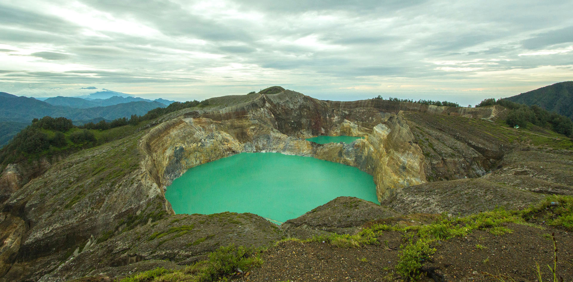 des Kelimutu – etwa 1.700 m hoch, freuen. Die drei Seen um den Vulkan wechseln aufgrund von gelösten Mineralien im Abstand von mehreren Jahren ihre Farbe von Schwarz zu Türkis, Rotbraun oder Grün. Der See im Westen heißt Tiwi Ata Mbupu (zu deutsch: See der Alten), die beiden anderen tragen die Namen Tiwu Nua Muri Kooh Tai (deutsch: See der Jungen und Mädchen) und Tiwu Ata Polo (deutsch: Verzauberter See).